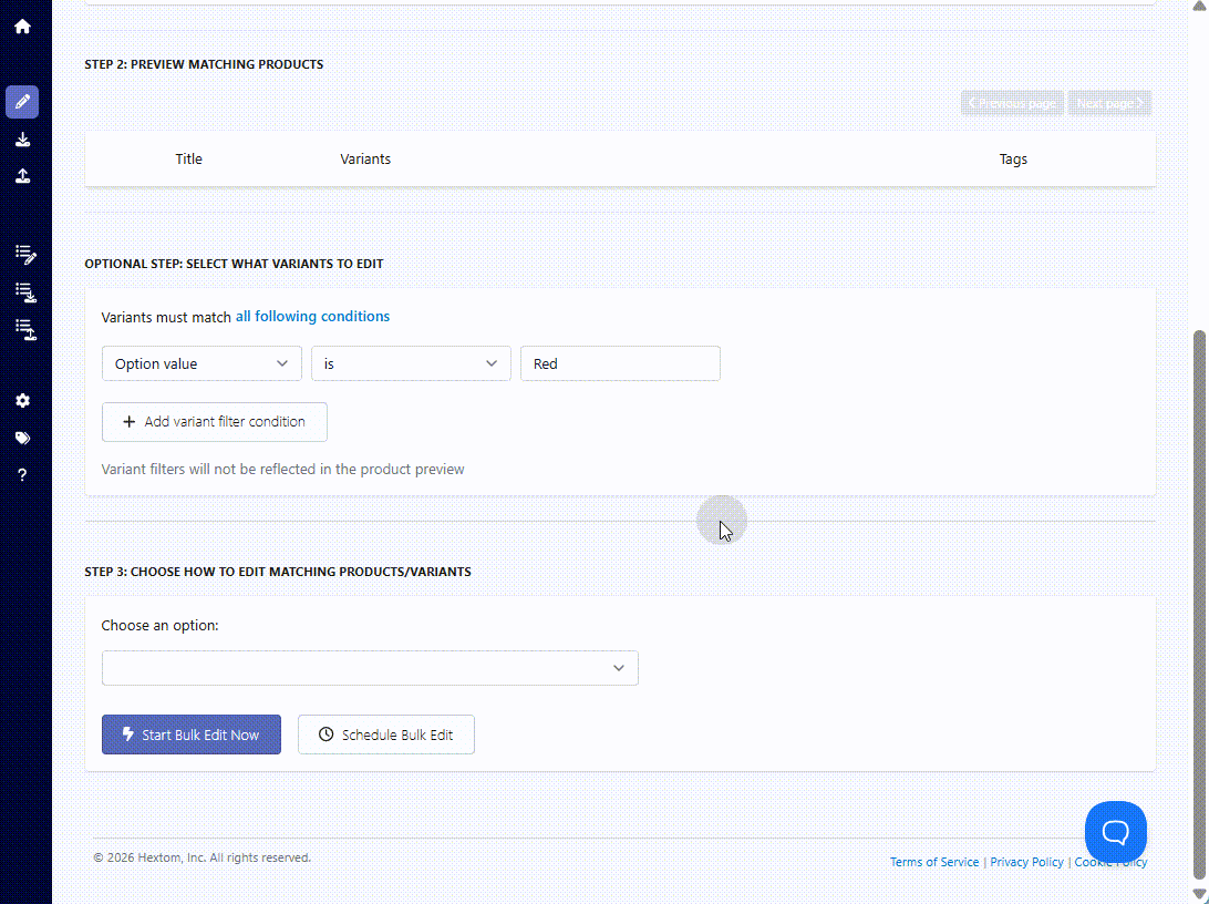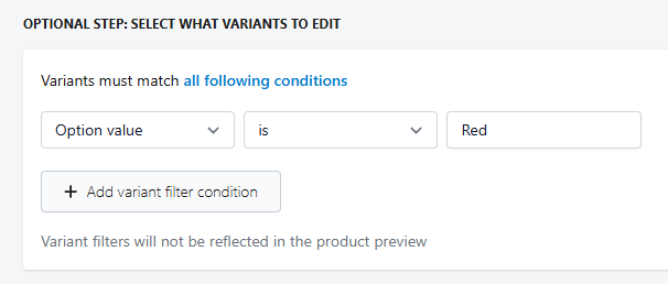If you would like to only bulk edit specific variants, such as only editing the Red variants, you can use our optional step to do so. Similar to our first step, there is a dropdown with numerous fields that you can use to select the variants to edit.