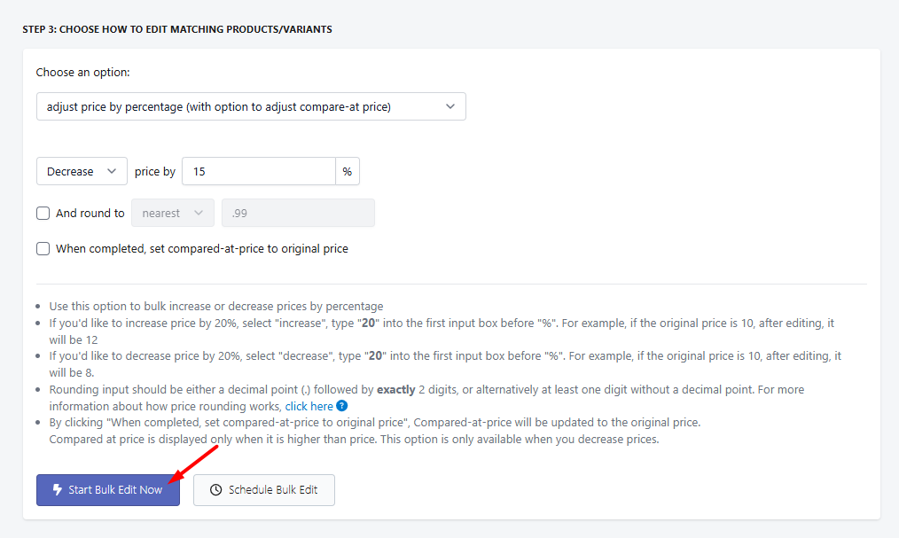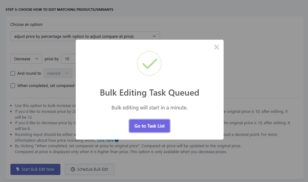 The next step would be to choose how you want to edit the products. The options available will change depending on the field that you selected in Step 1. For example, in the video below, I am setting up a task to decrease the price of the matched products by 15%.