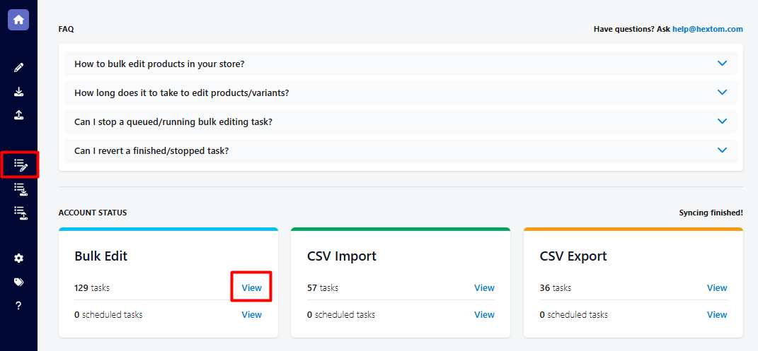 If you would like to undo a change made by our app at any point, you can do so by visiting the "Bulk Edit Tasks" history list. From the dashboard, there are two ways to get to this list: