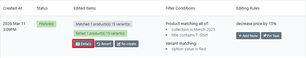 After the task is finished, you should be able to see the task details by clicking the "Details" button. You should also be able to see the changes on your Shopify Admin.