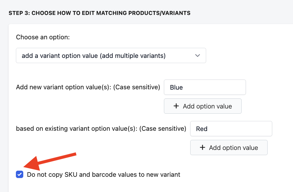 If you don’t want the SKU and barcode values copied to the new variants, you can select the Do not copy SKU and barcode values to new variants option.