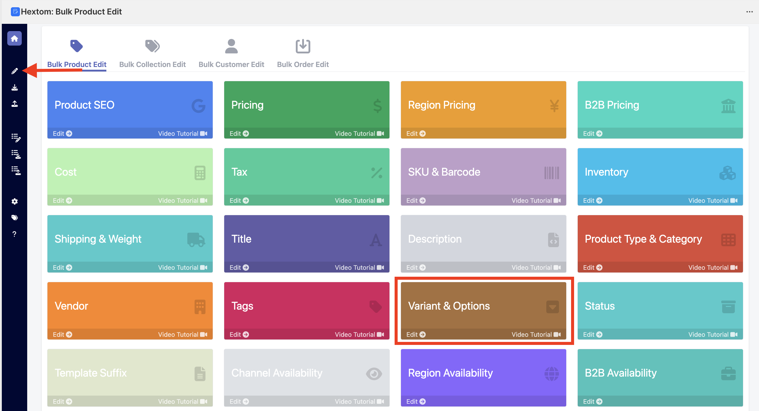 You can bulk edit your variant option values by selecting Variants and Options from the list of features on the app's dashboard or by going to the Bulk Edit page.