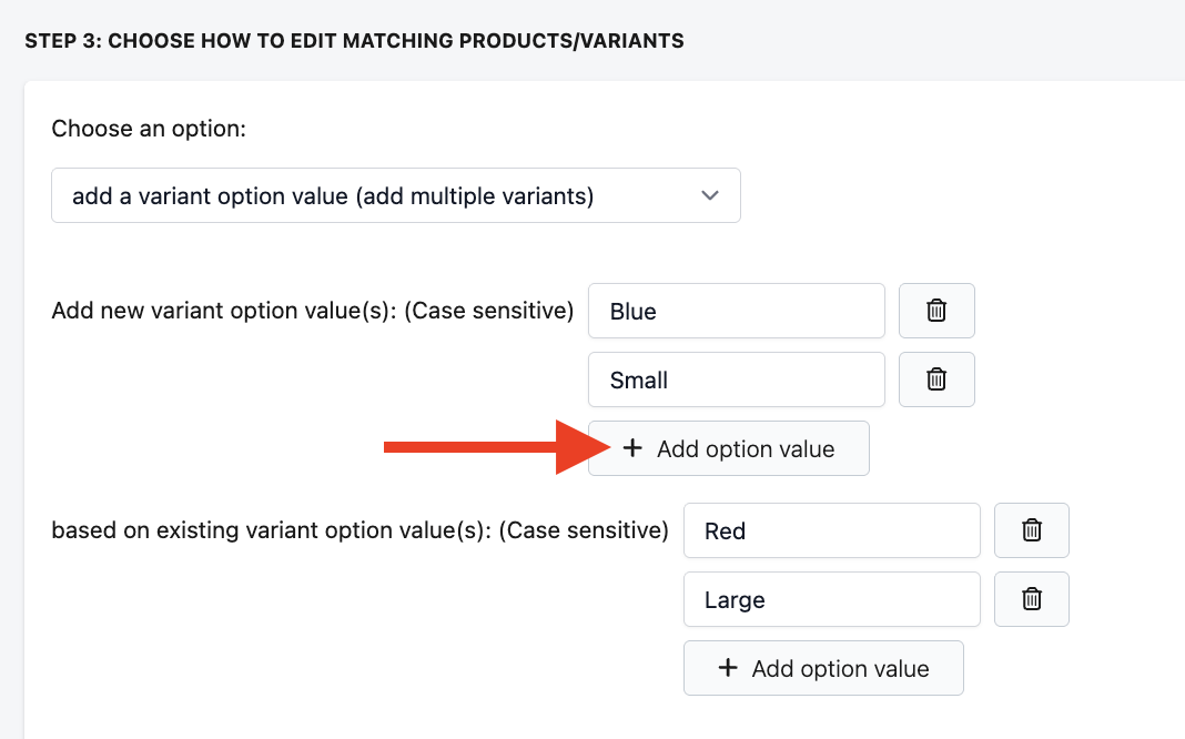 Optional: You can create multiple variant option values by clicking the Add option value button. For example, you could add Blue and Small based on the existing option values Red and Large. Just make sure you provide the same number of options for both the new variants and the existing/base variants.