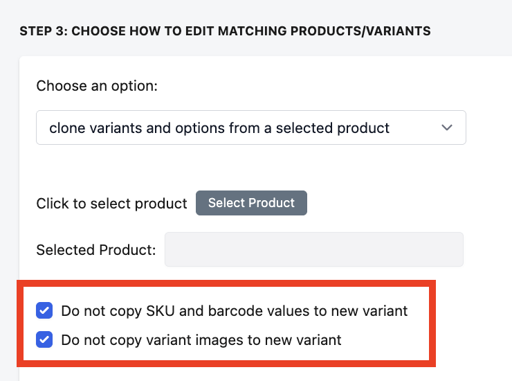 If you don’t want the SKU and barcode values copied to the new variants, you can select the Do not copy SKU and barcode values to new variants option. If you don't want the variant images copied to the new variants, you can select the Do not copy variant images to new variant.