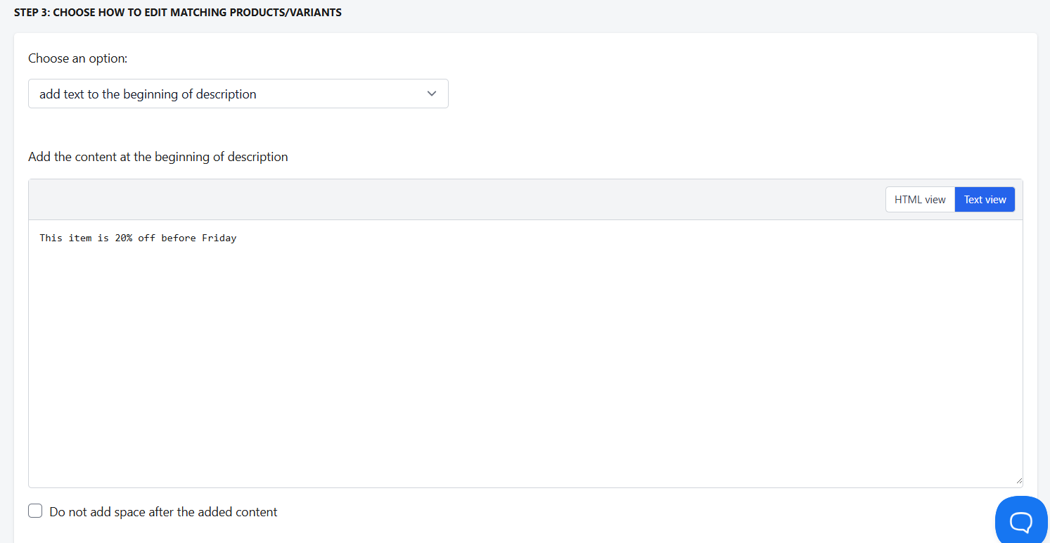 To add "This item is 20% off before Friday" to the beginning of matching products’ descriptions, type that text into the input box.