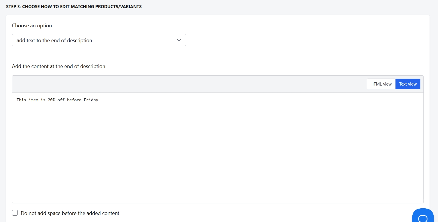 To add "This item is 20% off before Friday" to the end of matching products’ descriptions, type that text into the input box.