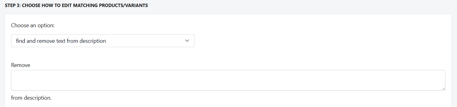 If your product description contains the sentence "Hurry! Limited stock available" and you want to remove it from all matching products, simply enter that phrase in the remove field.