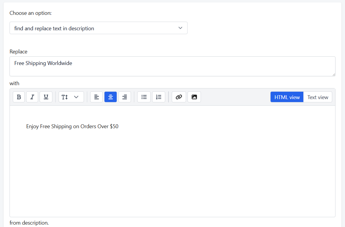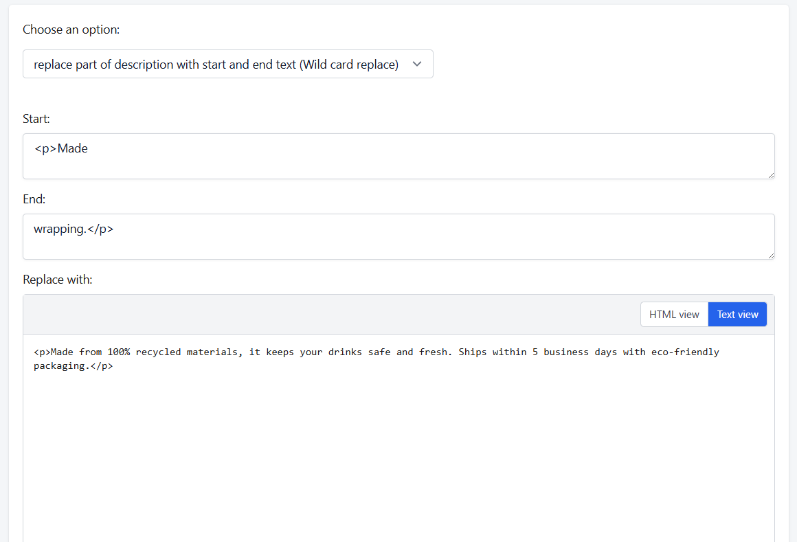 Use this option to replace a specific portion of a product description between defined start and end points.