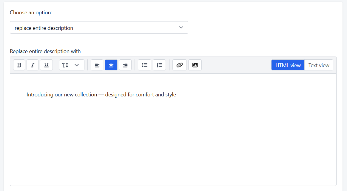 You can choose the function you want to use to edit your product description with, and set up the function as needed. Our app has the following options: