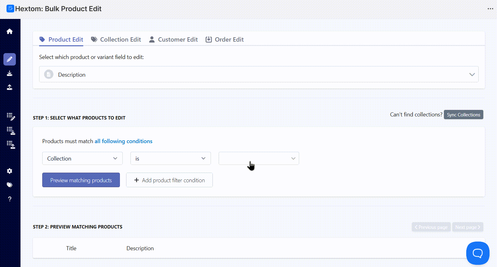 The first step to setting up a bulk edit is to set up the filters. Our app has many fields that you can filter from, which can help you narrow down the products that you would like our app to edit. Our app also comes with a preview function, so that you can verify if the products found are correct.