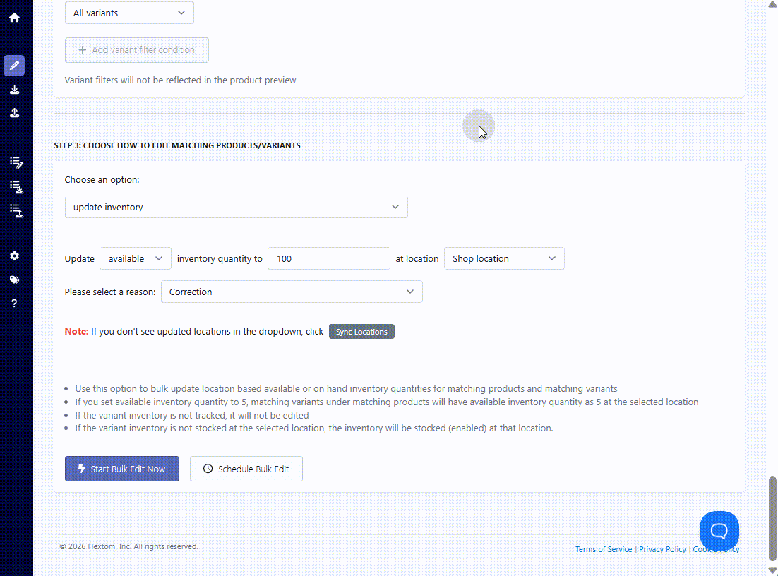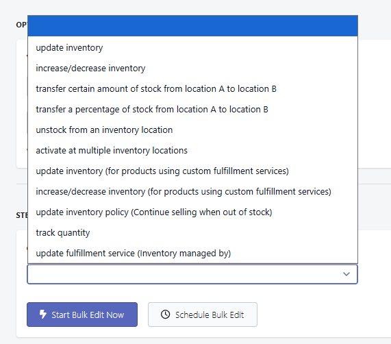 This function allows you to make bulk changes to inventory across your product variants directly from the app. Whether you need to set or adjust stock quantities, transfer inventory between locations, activate or unstock a location, or update settings like inventory policy, fulfillment service, and quantity tracking, everything can be done in just a few steps without editing each variant one by one.