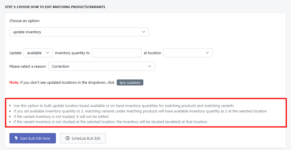 Note: Your products/variants must have inventory tracking enabled in Shopify for our app to edit their inventory numbers. If tracking is off, those variants will be skipped. You may also bulk enable inventory tracking through this feature under the "Track Quantity" edit option.