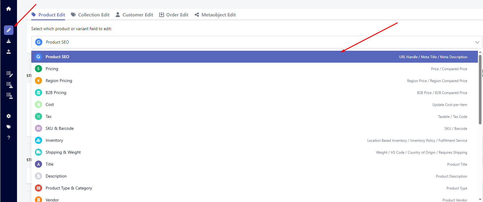 The first step to setting up a bulk edit is choosing the task that you want to run. For this guide, we will be choosing "Product SEO". Kindly go to "Bulk Edit" Then choose "Product SEO"