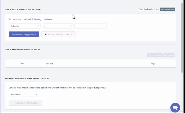 Once selected, we will need to set up the filters. Our app has many fields that you can filter from, which can help you narrow down the products that you would like our app to edit. Our app also comes with a preview function, so that you can verify if the products found are correct.