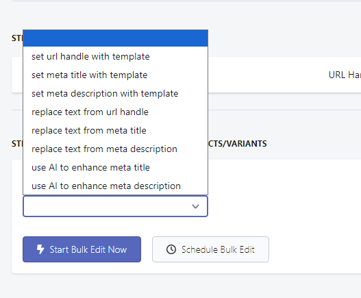 This function will allow you to set and replace URL Handles, Meta Titles, Meta Descriptions.