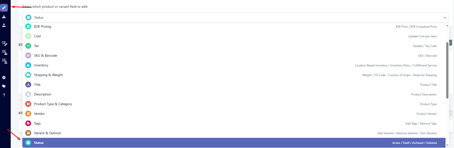 The first step for every edit is to choose the proper field to edit. For this Guide you'll want to choose "Status"
