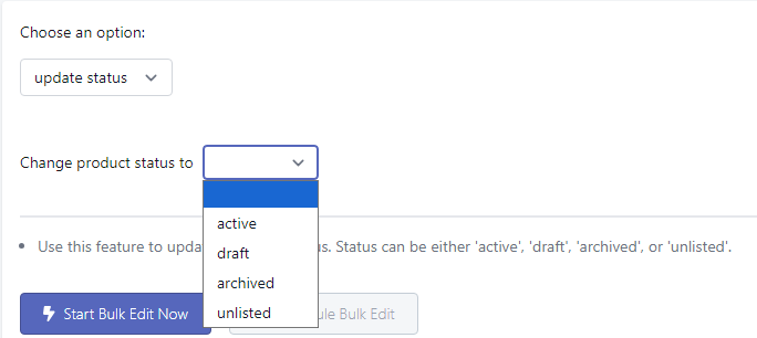 This function will allow you to set your product status to Active, Draft, or Archived. You can edit the product status with the following steps: