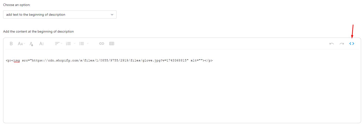 The best way to add an image to your description using our app would be to copy and paste them directly from the Shopify Admin into our app. A fast way to populate or add an image to many products at once would be to manually add the image by inserting it to a single product first, then copy the image from the Shopify Admin and paste it into our app for bulk adding.