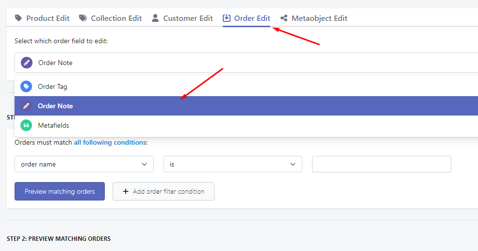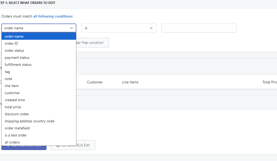 The second step to setting up a bulk order edit is to set up the filters. Our app has many fields that you can filter from, which can help you narrow down the order that you would like our app to edit. Our app also comes with a preview function, so that you can verify if the orders found are correct.