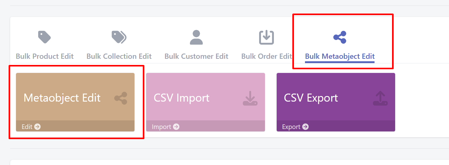 You can find our metaobject editing under the Bulk Metaobject Edit tab on the homepage, or on the Bulk Edit page.