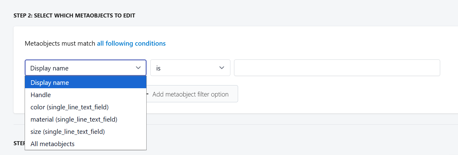 You can create a filter for the metaobjects that you are looking to edit using our apps filter conditions. You can filter by the Display name, Handle, or by looking for a specific value in any of the metaobject fields.