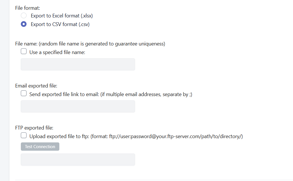 Set a custom file name, select a file format, and optionally email the file or upload it to an FTP/SFTP server.