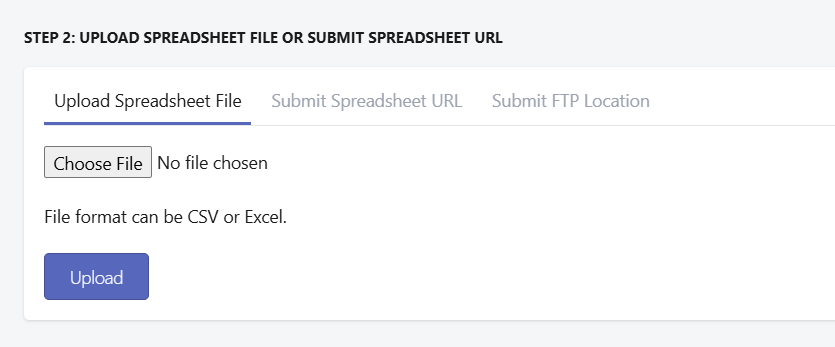 Upload your CSV file from your device, a public spreadsheet URL, or an FTP/SFTP location.