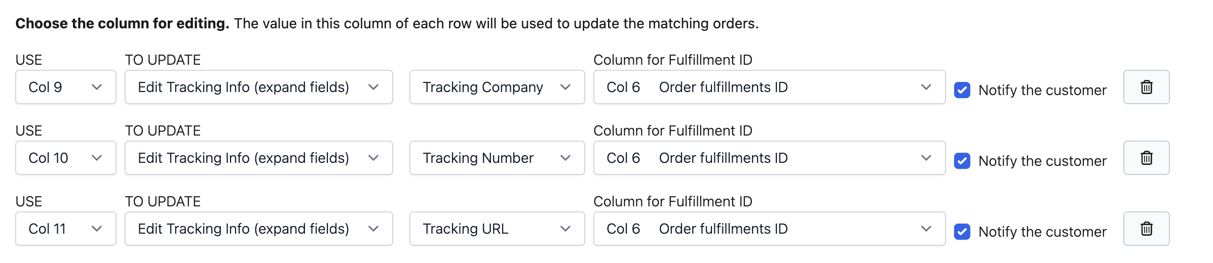 The form will then prompt you to select the column for the fulfillment ID and indicate whether to notify the customers who placed the orders. This prompt will appear for each of the columns where tracking info is being edited, but the form will ensure that the values remain consistent across all these columns.